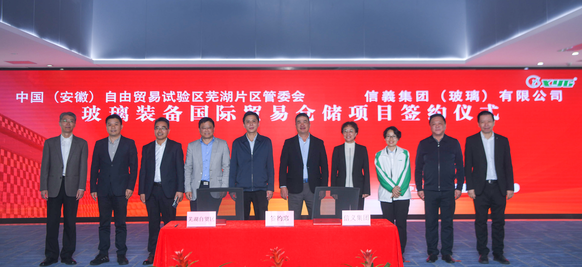 2022年11月4日下午,信義集团(玻璃)有限公司与中国(安徽)自贸试验区芜湖片区管委会在信義研发中心举行玻璃装备国际贸易仓储项目签约仪式,芜湖市委常委、副市长杨正,市政府副秘书长刘兴荣,信義玻璃执行董事兼行政总裁董清世出席,自贸试验区芜湖片区管委会主任何红旗与信義玻璃副总裁郭建林签约,市商务局、芜湖海关、市投资促进中心等有关单位见证签约。