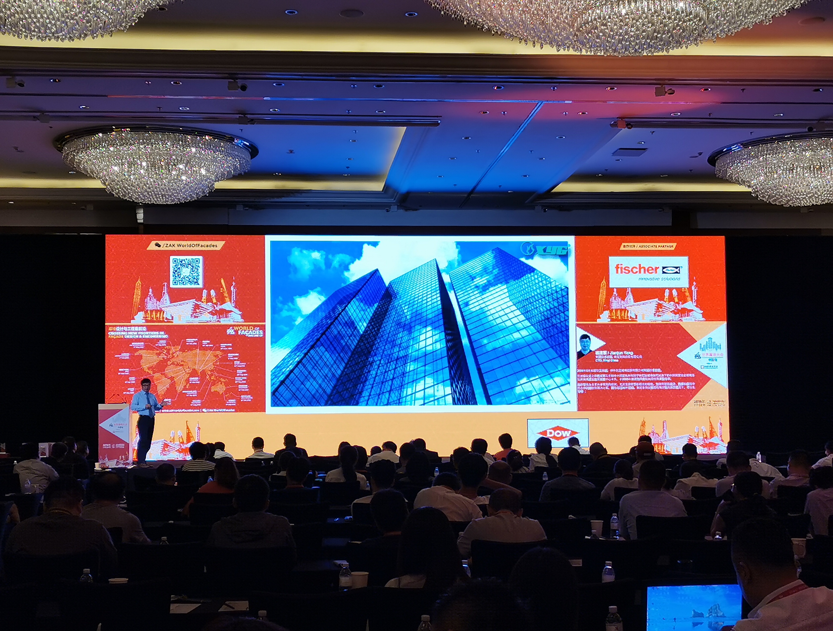作为此次会议的合作伙伴,信义玻璃在会议期间展示了双银Low-E中空玻璃、三银Low-E夹层中空玻璃、超白超厚SGP夹胶玻璃、彩釉打印玻璃等高端建筑玻璃产品。信义玻璃集团技术总监杨建军先生出席会议,并作了题为《幕墙玻璃的选择》的专题演讲,从幕墙玻璃的发展趋势、产品选择等方面和与会者进行了探讨、交流及案例分享,得到了与会者的一致认可与好评。