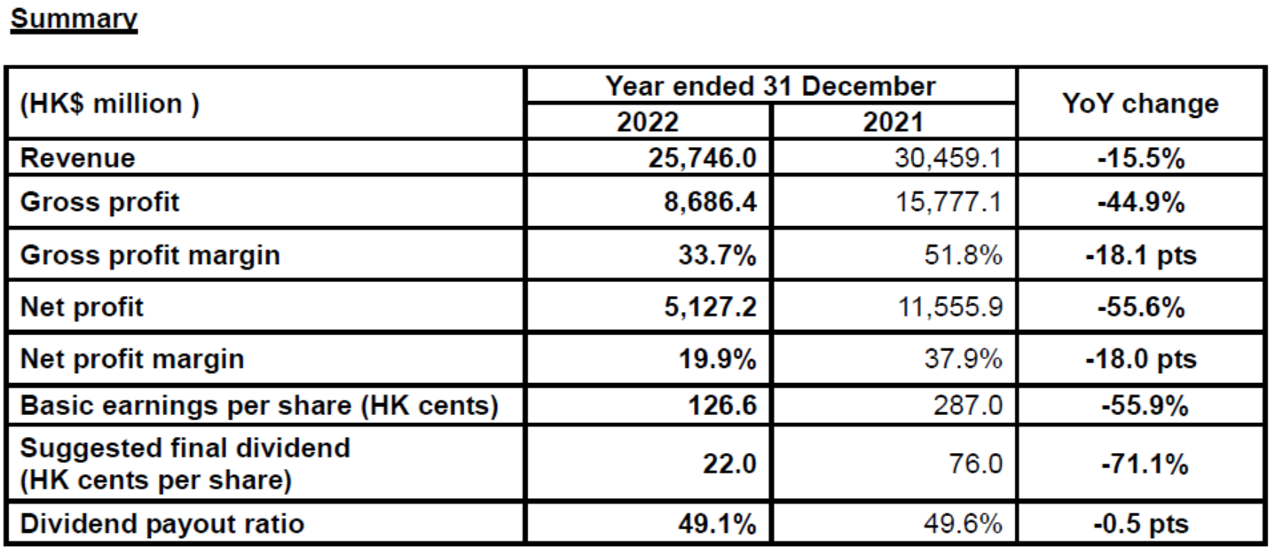 Duringthe year under review, the Group persevered and forged aheaddespite the macroeconomic environment and policies that impactedthe industry. Its revenue was HK$25,746.0 million (2021: HK$30,459.1 million). Gross profit was HK$8,686.4 million (2021: HK$15,777.1 million), a decrease of 44.9% year-on-year, with gross profit margin at33.7% (2021: 51.8%). The Group’s profit was squeezed by loweraverage selling prices of float glass due toweaker demand fromthe construction industry inChina,as well ashigher raw material costs. Net profit of the Group declinedby55.6% to HK$5,127.2million (2021: HK$11,555.9 million), net profit margin fell by 18.0percentage points to 19.9% (2021:37.9%). Basic earnings per share were HK126.6cents (2021: HK287.0 cents).